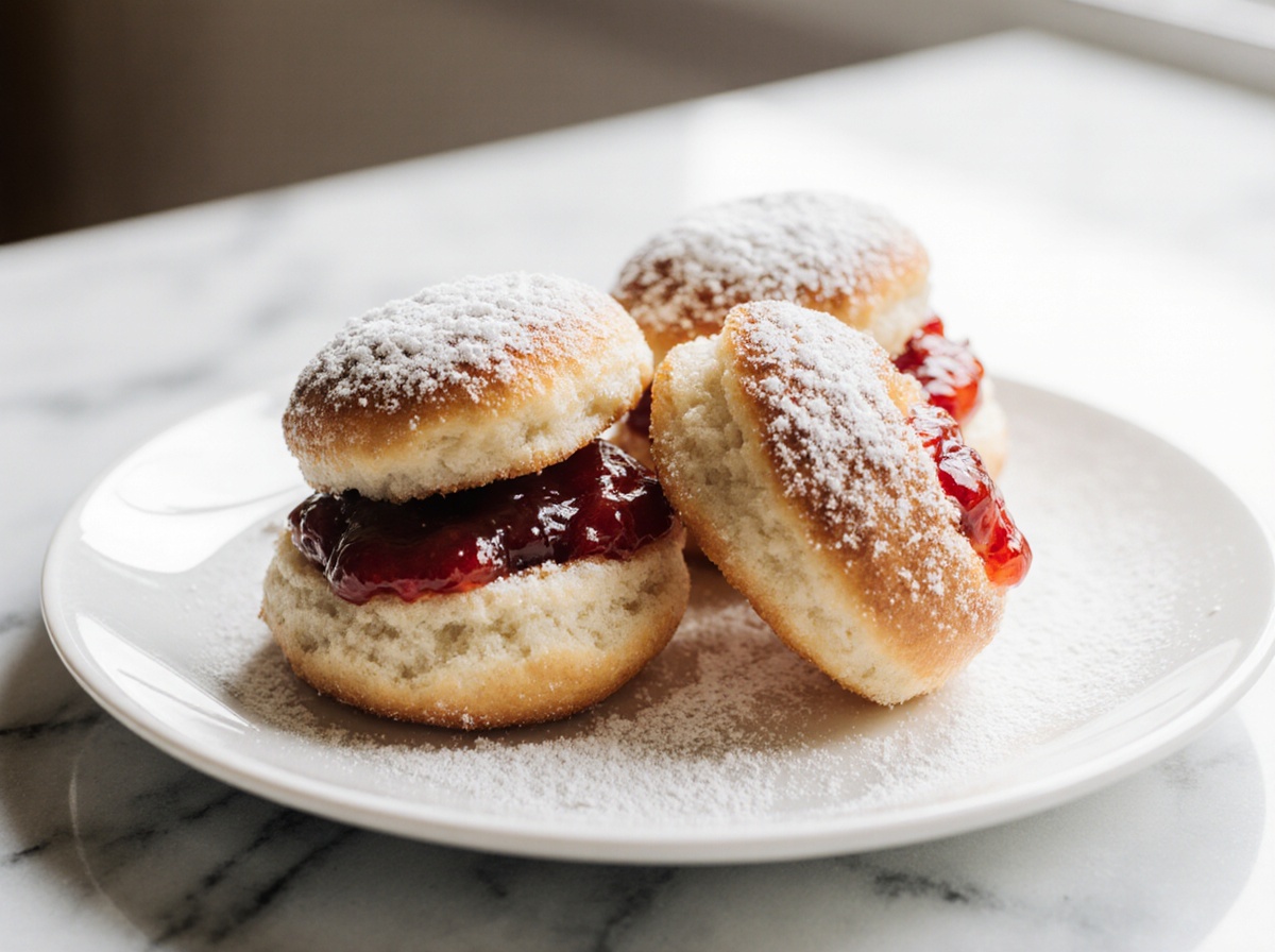 Wichtig ist das doppelte Gehen: 45 Min. an einem warmen Ort, dann noch einmal 20 Min. nach dem Formen. Achtet darauf, die Teiglinge nicht zu fest zu rollen, so bleiben sie innen wunderbar luftig. Nach dem Backen direkt mit Puderzucker bestäuben – das sorgt dafür, dass sie außen schön knusprig werden.