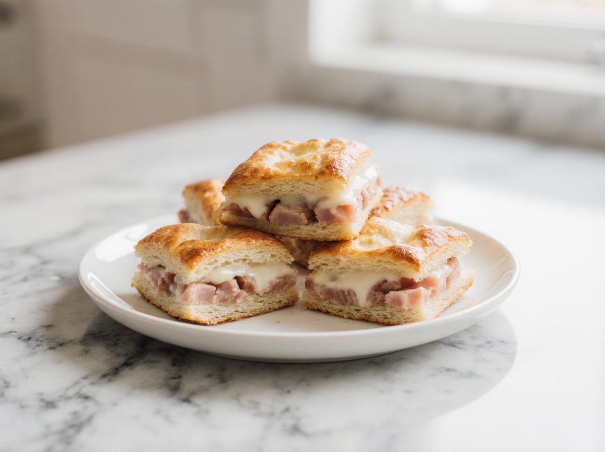 - 3. Verteile Schinken und Käse oder deine Wunschfüllung in der Mitte und klappe den Teig zu Rechtecken zusammen.