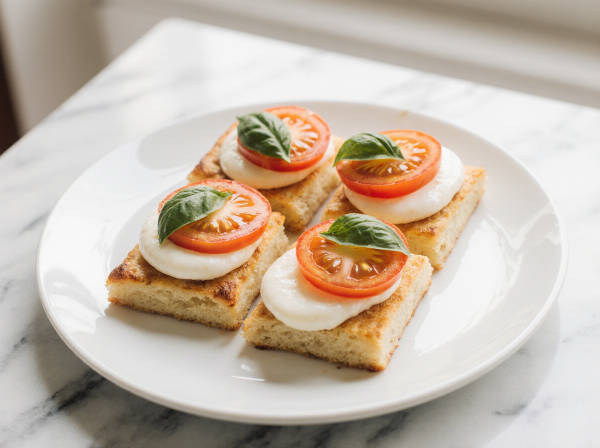• Schritt 2: Jedes Quadrat mit einer Scheibe Tomate, einem Stück Mozzarella und frischen Basilikumblättern belegen.