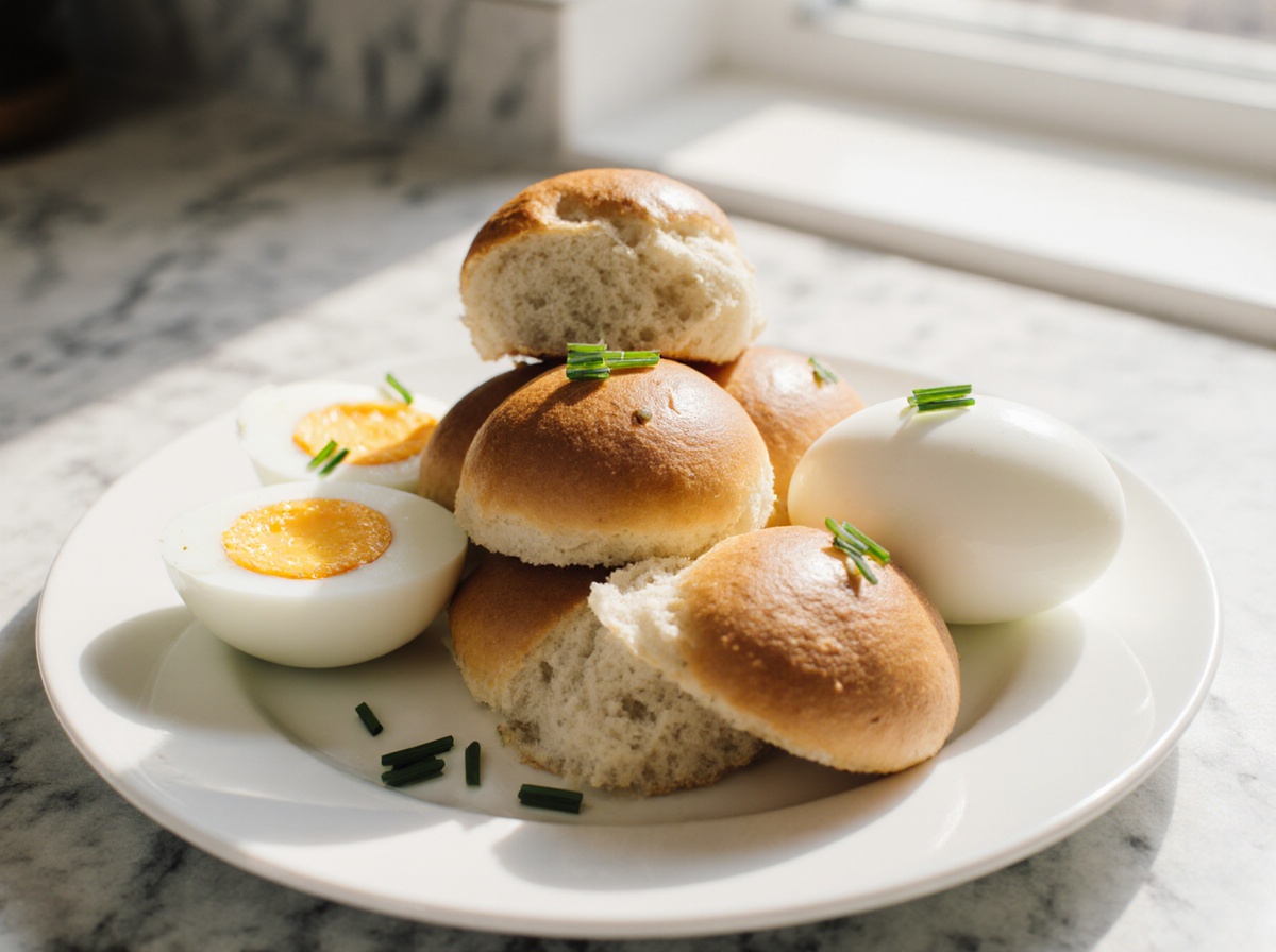 • 5. Nimm Eier und Brötchen vorsichtig heraus. Tauche die Eier in kaltes Wasser, um den Garprozess zu stoppen.