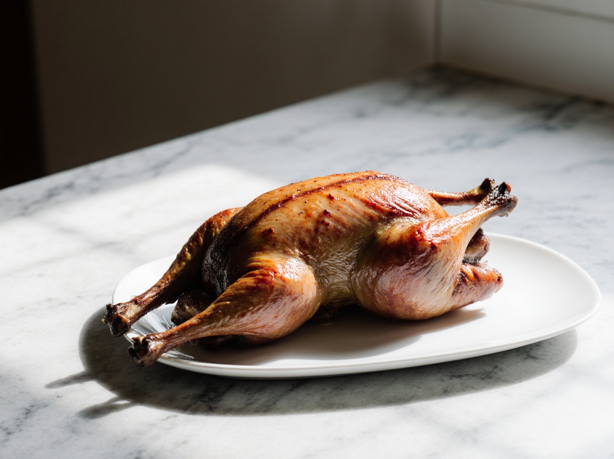 Prüfe zum Schluss mit einem Fleischthermometer: Die Kerntemperatur sollte 75 °C in der dicksten Stelle der Keule erreichen. Nach dem Garen lasse ich die Ente 5 Minuten ruhen, bevor ich sie tranchiere.